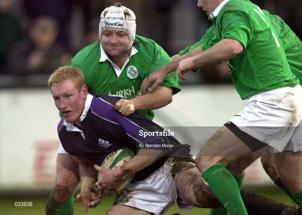18 February 2000; Cameron Mather of Scotland is tackled by Shane Byrne of Ireland during the Six Nations A Rugby Championship match between Ireland and Scotland at Donnybrook Stadium in Dublin. Photo by Brendan Moran/Sportsfile