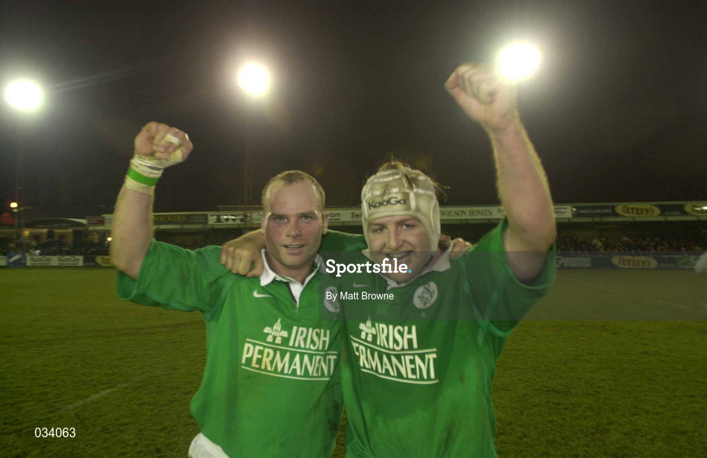 4 February 2000; Ireland players Paul Burke, left, and team captain Shane Byrne celebrate after the Six Nations A Rugby Championship match between England and Ireland at Franklins Gardens in Northampton, England. Photo by Matt Browne/Sportsfile