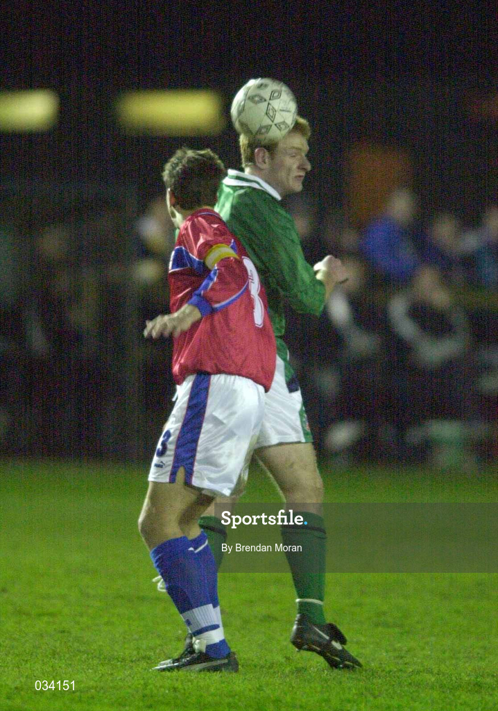 22 February 2000; Gary Doherty of Republic of Ireland heads the ball ahead of Adam Petrous of Czech Republic during the U21 International Friendly match between Republic of Ireland and Czech Republic at Belfield, UCD, in Dublin. Photo by Brendan Moran/Sportsfile