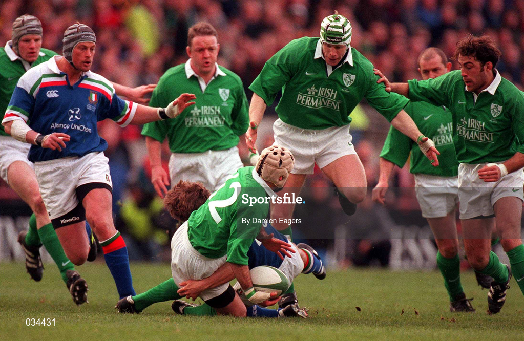 4 March 2000; Mike Mullins of Ireland, supported by team-mates Simon Easterby and Kieron Dawon, right, during the Lloyds TSB 6 Nations match between Ireland and Italy at Lansdowne Road in Dublin. Photo by Damien Eagers/Sportsfile