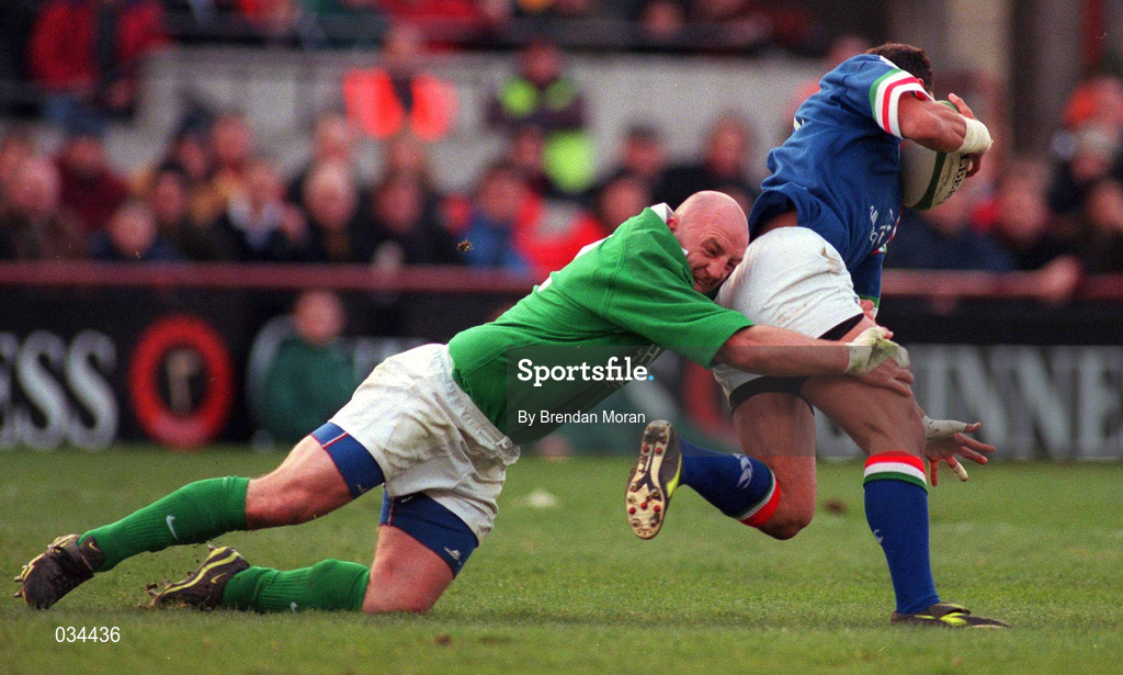 4 March 2000; Luca Martin of Italy is tackled by Keith Wood of Ireland during the Lloyds TSB 6 Nations match between Ireland and Italy at Lansdowne Road in Dublin. Photo by Brendan Moran/Sportsfile
