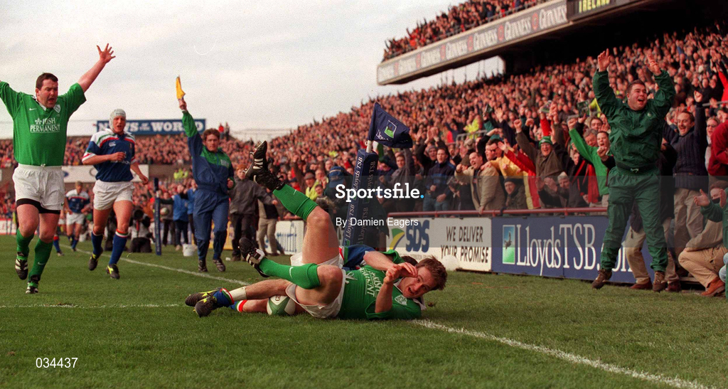 4 March 2000; Denis Hickie of Ireland scores a try that was ruled out by the touch judge during the Lloyds TSB 6 Nations match between Ireland and Italy at Lansdowne Road in Dublin. Photo by Damien Eagers/Sportsfile