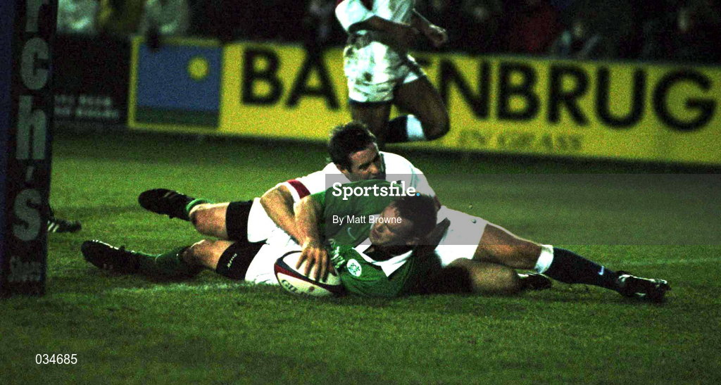 4 February 2000; John Kelly of Ireland scores his side's second try, despite the efforts of Nick Walshe of England during the Six Nations A Rugby Championship match between England and Ireland at Franklins Gardens in Northampton, England. Photo by Matt Browne/Sportsfile