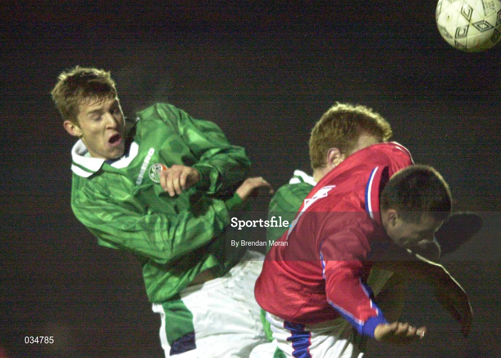 22 February 2000; Martin Rowlands, left, and Gary Doherty of Republic of Ireland in action against Martin Cupr of Czech Republic during the U21 International Friendly match between Republic of Ireland and Czech Republic at Belfield, UCD, in Dublin. Photo by Brendan Moran/Sportsfile