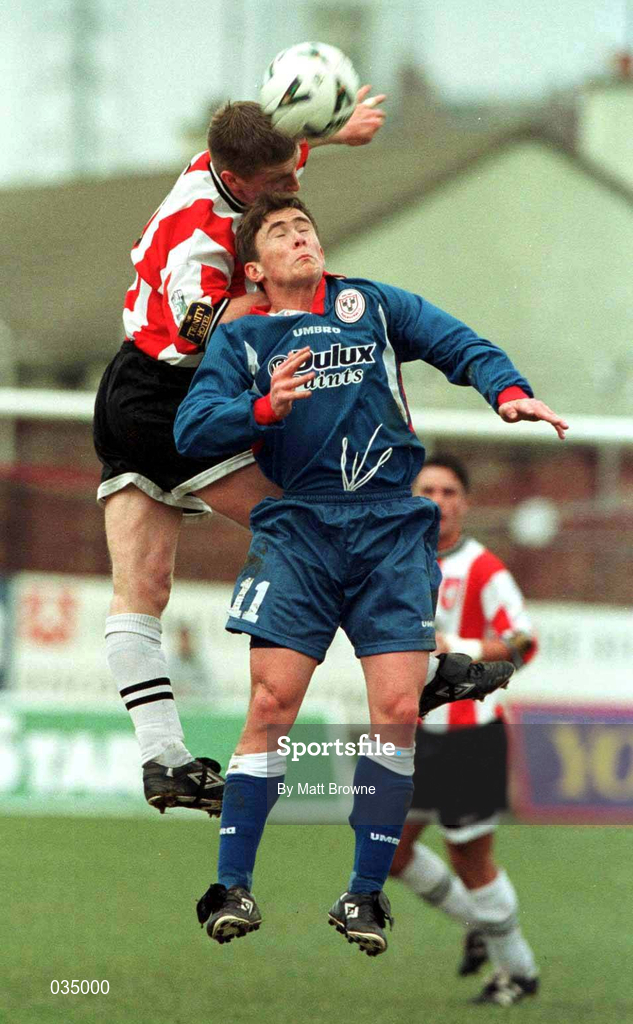 7 March 1999; Richie Baker of Shelbourne goes up for the ball with with Eamonn Doherty of Derry City during the FAI Cup quarter-final match between Derry City and Shelbourne at The Brandywell Stadium in Derry. Photo by Matt Browne/Sportsfile