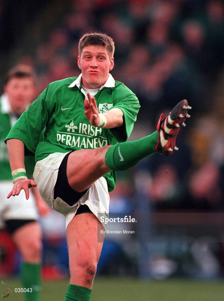 4 March 2000; Ronan O'Gara of Ireland kicks to touch during the Lloyds TSB 6 Nations match between Ireland and Italy at Lansdowne Road in Dublin. Photo by Brendan Moran/Sportsfile
