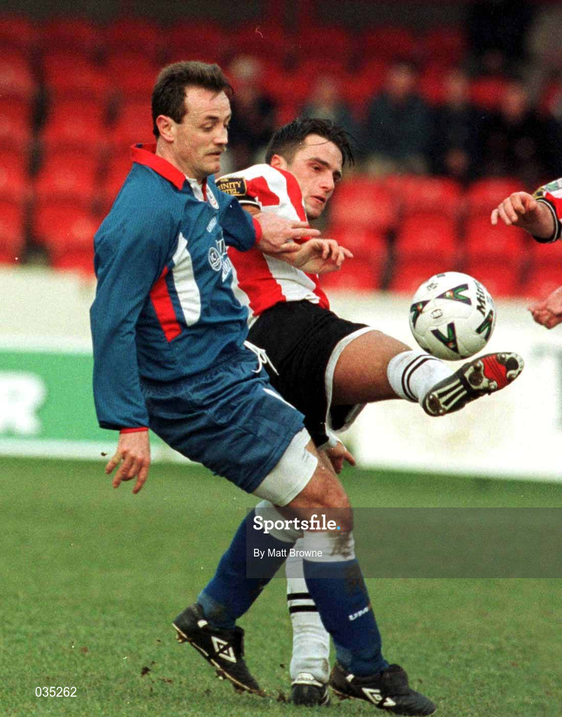7 March 1999; Stephen Geoghegan of Shelbourne is tackled by Darren Kelly of Derry City during the FAI Cup quarter-final match between Derry City and Shelbourne at The Brandywell Stadium in Derry. Photo by Matt Browne/Sportsfile