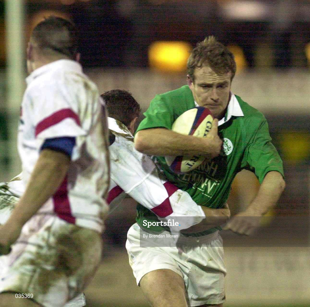 4 February 2000; Denis Hickie Ireland A in action against Alistair Hepher England A during the Six Nations A Rugby Championship match between England and Ireland at Franklins Gardens in Northampton, England. Photo by Brendan Moran/Sportsfile
