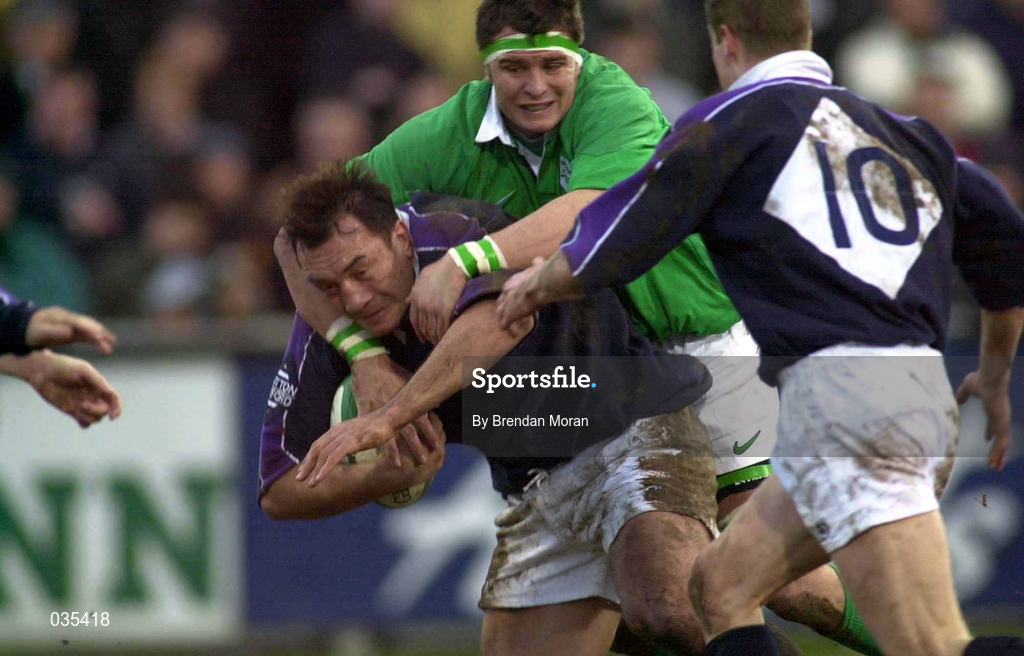 18 February 2000; Don Mackinnon of Scotland is tackled by Dion O'Cuinneagain of Ireland during the Six Nations A Rugby Championship match between Ireland and Scotland at Donnybrook Stadium in Dublin. Photo by Brendan Moran/Sportsfile