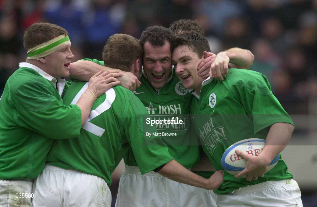 18 March 2000; David Wallace of Ireland, right, celebrates scoring a try with team-mates, from left, Eric Elwood, Killian Keane and Paul Wallace during the Six Nations A Rugby Championship match between France and Ireland at Stade Marcel-Michelin in Clermont-Ferrand, France. Photo by Matt Browne/Sportsfile