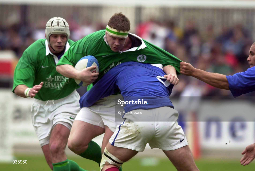 18 March 2000; Paul Wallace of Ireland is tackled by Eric Bertrand and Laurent Pedrosa of France during the Six Nations A Rugby Championship match between France and Ireland at Stade Marcel-Michelin in Clermont-Ferrand, France. Photo by Matt Browne/Sportsfile