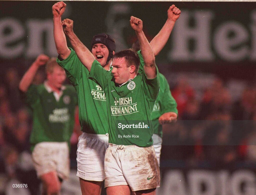 31 March 2000; Ireland players John Kelly, right, and Tony McWhirter celebrate following the Six Nations A Rugby Championship match between Ireland and Wales at Donnybrook Stadium in Dublin. Photo by Aoife Rice/Sportsfile
