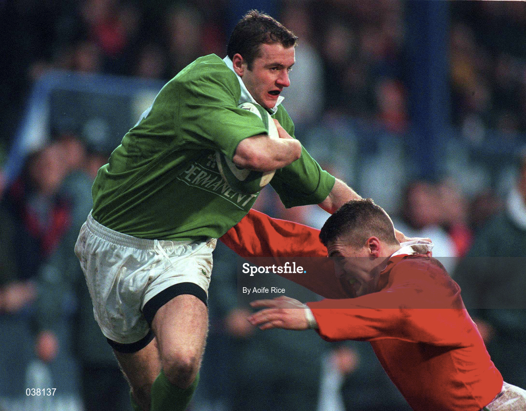 31 March 2000; Geordan Murphy of Ireland is tackled by Delme Williams of Wales during the Six Nations A Rugby Championship match between Ireland and Wales at Donnybrook Stadium in Dublin. Photo by Aoife Rice/Sportsfile