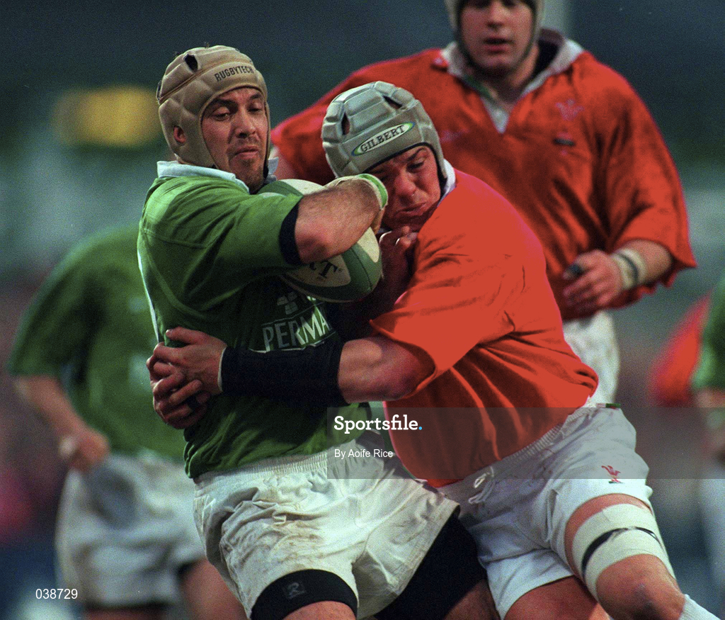 31 March 2000; Mike Mullins of Ireland is tackled by Chris Stephens of Wales during the Six Nations A Rugby Championship match between Ireland and Wales at Donnybrook Stadium in Dublin. Photo by Aoife Rice/Sportsfile