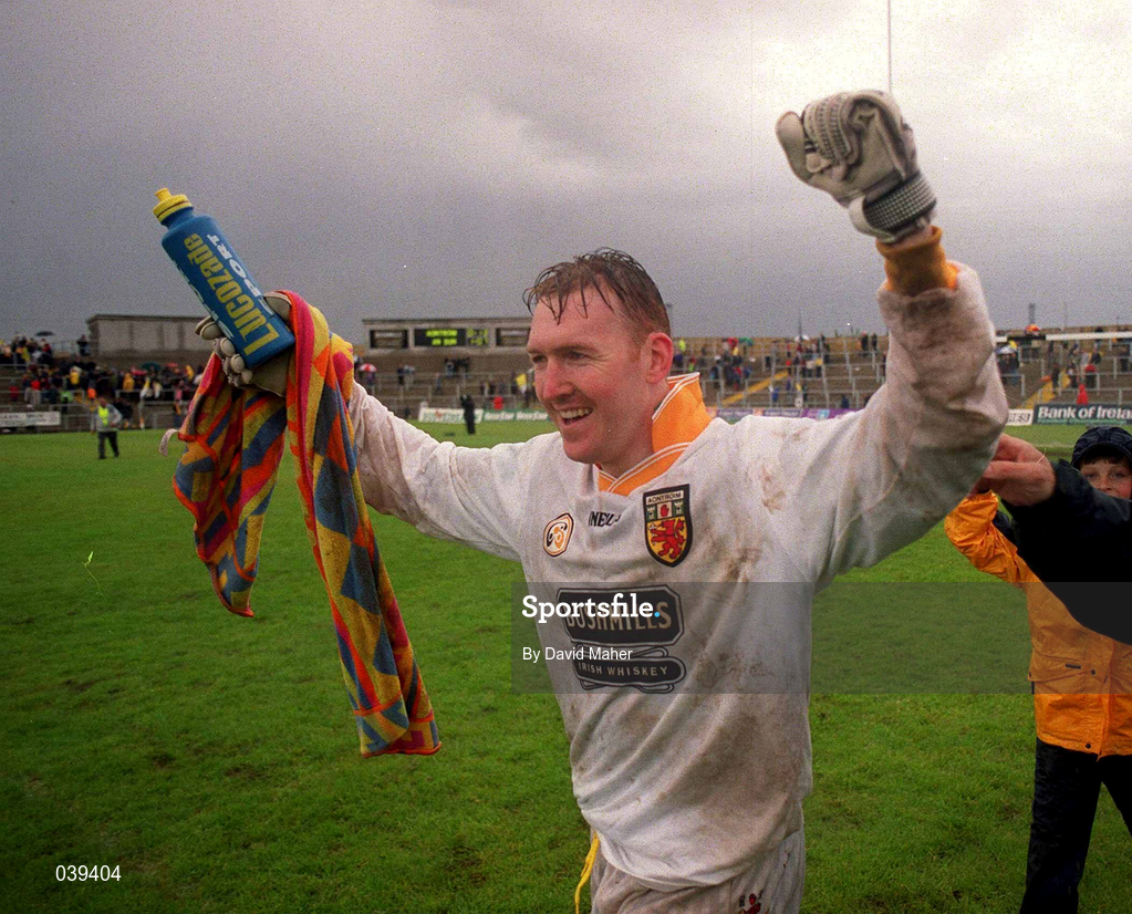 28 May 2000; Antrim goalkeeper Sean McGreevy celebrates following the Bank of Ireland Ulster Senior Football Championship Quarter-Final match between Antrim and Down at Casement Park in Belfast, Antrim. Photo by David Maher/Sportsfile