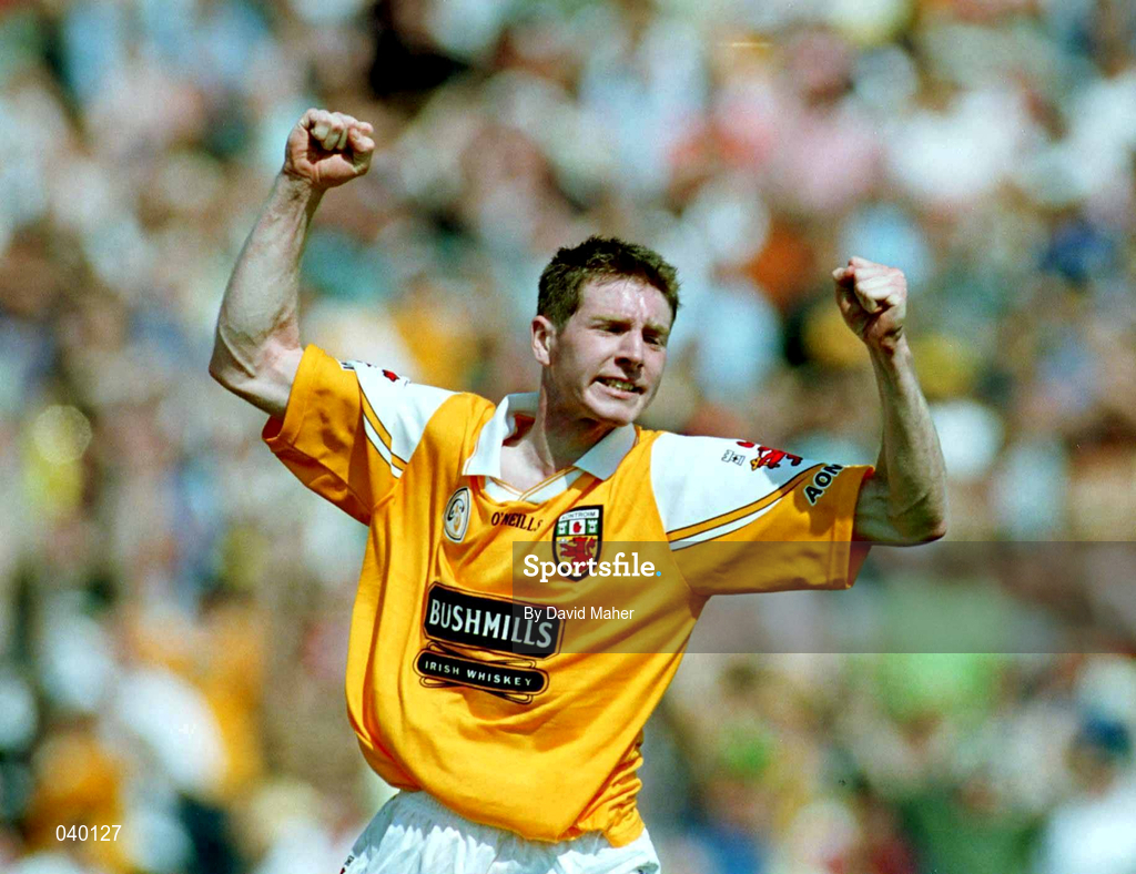 18 June 2000; Kevin Brady of Antirm celebrates after scoring his side's second goal during the Bank of Ireland Ulster Senior Football Championship Semi-Final match between Antrim and Derry at Casement Park in Derry. Photo by David Maher/Sportsfile