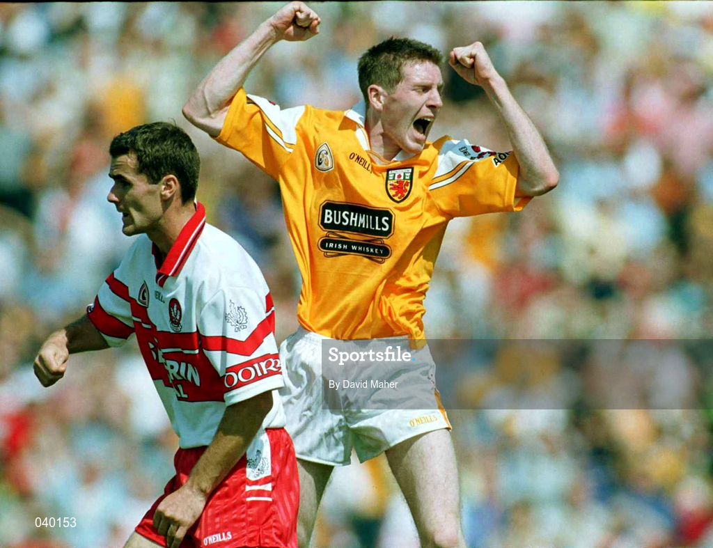 18 June 2000; Kevin Brady of Antrim celebrates after scoring his side's second goal during the Bank of Ireland Ulster Senior Football Championship Semi-Final match between Antrim and Derry at Casement Park in Derry. Photo by David Maher/Sportsfile