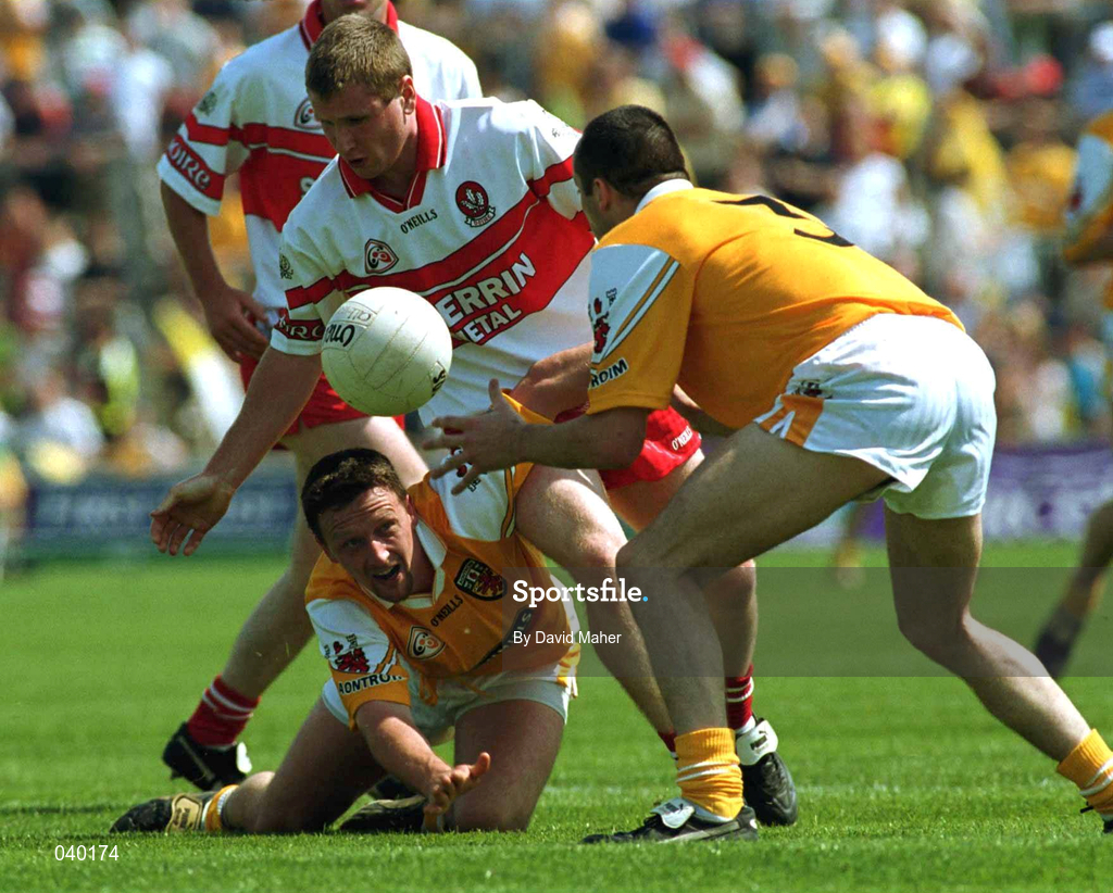 18 June 2000; Aidan Morris of Antrim offloads possession to team-mate Martin Mulholland despite the attention of Derry's Niall McCusker during the Bank of Ireland Ulster Senior Football Championship Semi-Final match between Antrim and Derry at Casement Park in Derry. Photo by David Maher/Sportsfile