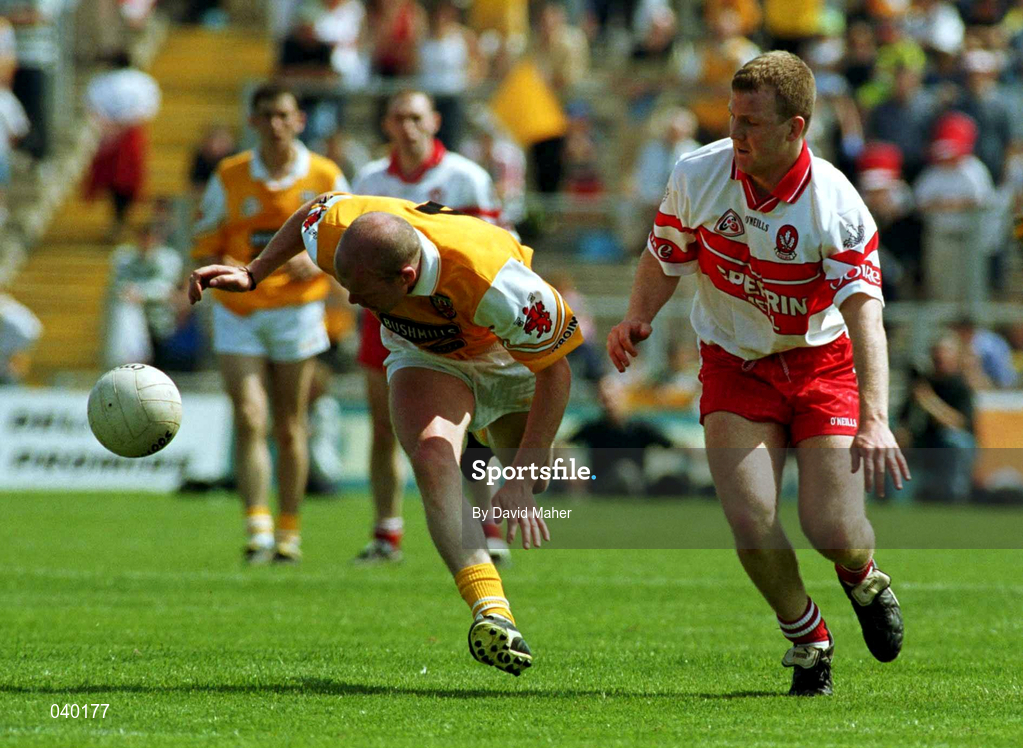 18 June 2000; Anto Finnegan of Antrim in action against Niall McCusker of Derry during the Bank of Ireland Ulster Senior Football Championship Semi-Final match between Antrim and Derry at Casement Park in Derry. Photo by David Maher/Sportsfile