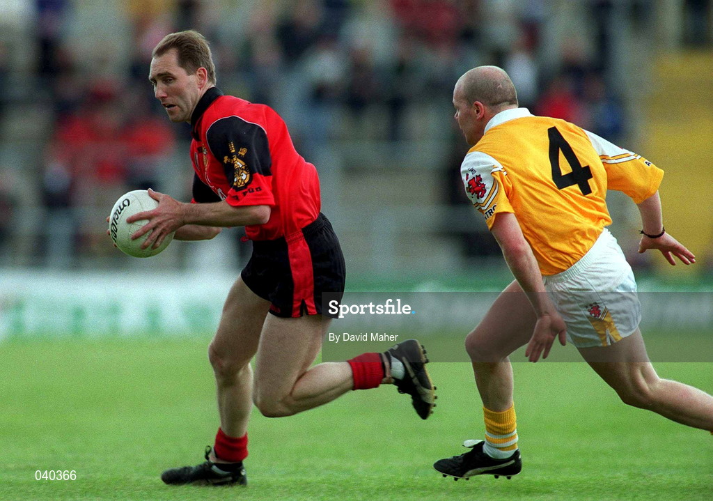 28 May 2000; Mickey Linden of Down in action against Anto Finnegan of Antrim during the Bank of Ireland Ulster Senior Football Championship Quarter-Final match between Antrim and Down at Casement Park in Belfast, Antrim. Photo by David Maher/Sportsfile