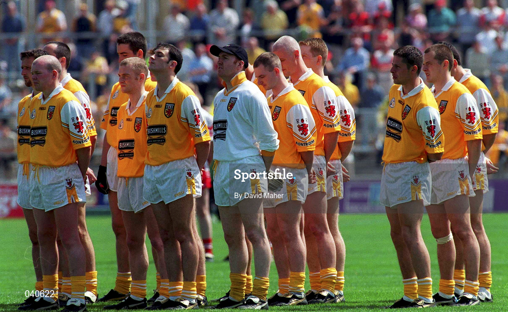 25 June 2000; The Antrim team stand for Amhrán na bhFiann prior to the Bank of Ireland Ulster Senior Football Championship Semi-Final match between Antrim and Derry at Casement Park in Belfast, Antrim. Photo by David Maher/Sportsfile