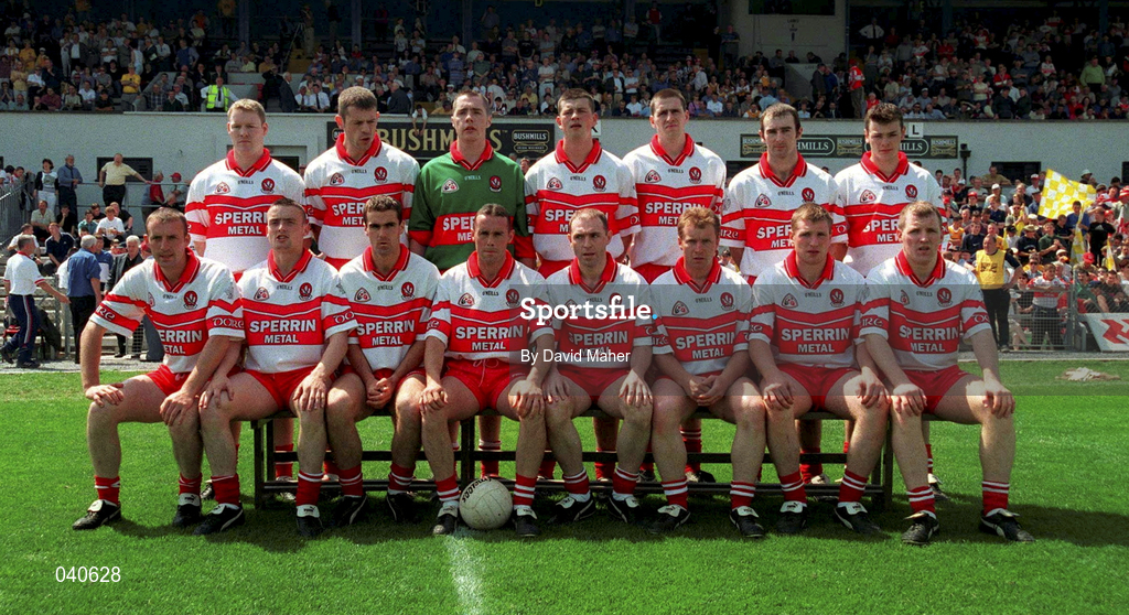 25 June 2000; The Derry team prior to the Bank of Ireland Ulster Senior Football Championship Semi-Final match between Antrim and Derry at Casement Park in Belfast, Antrim. Photo by David Maher/Sportsfile