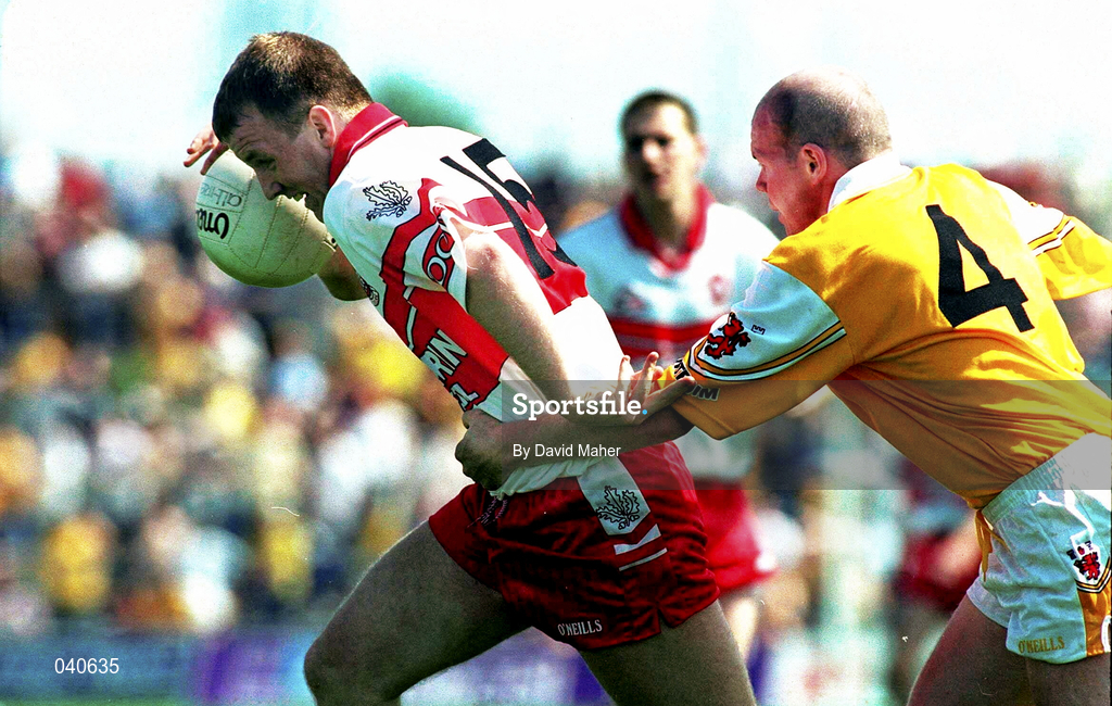25 June 2000; Johnny McBride of Derry holds off Anto Finnegan of Antrim during the Bank of Ireland Ulster Senior Football Championship Semi-Final match between Antrim and Derry at Casement Park in Belfast, Antrim. Photo by David Maher/Sportsfile