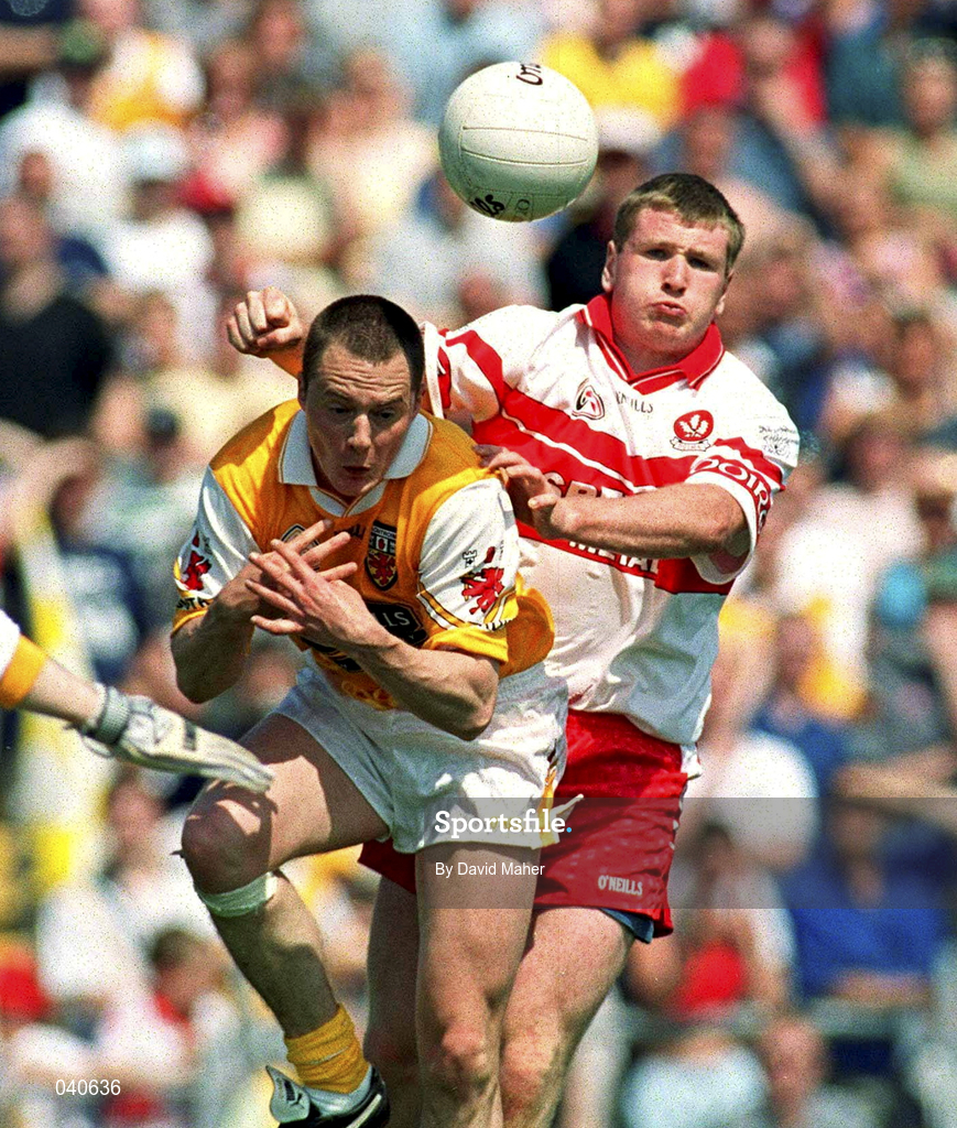 25 June 2000; Niall McCusker of Derry in action against John Kelly of Antrim during the Bank of Ireland Ulster Senior Football Championship Semi-Final match between Antrim and Derry at Casement Park in Belfast, Antrim. Photo by David Maher/Sportsfile