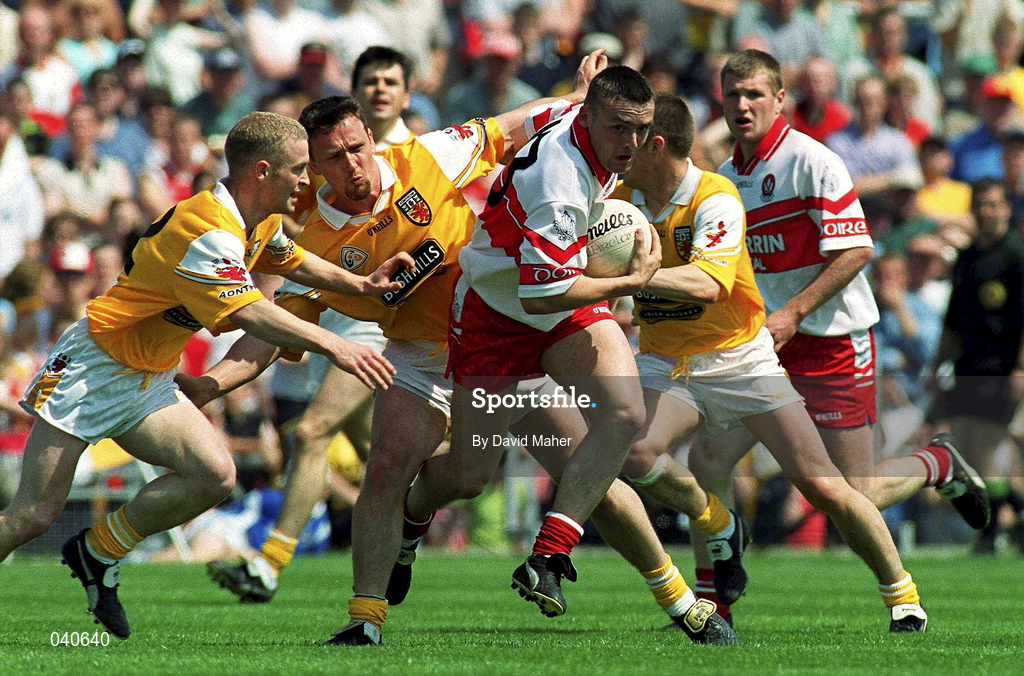 25 June 2000; Patrick Bradley of Derry in action against Enda McLernon, left, and Aidan Morris of Antrim during the Bank of Ireland Ulster Senior Football Championship Semi-Final match between Antrim and Derry at Casement Park in Belfast, Antrim. Photo by David Maher/Sportsfile