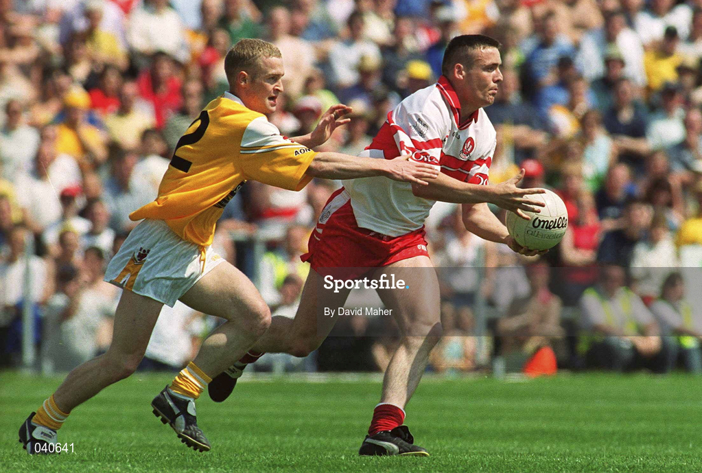 25 June 2000; Patrick Bradley of Derry in action against Enda McLernon of Antrim during the Bank of Ireland Ulster Senior Football Championship Semi-Final match between Antrim and Derry at Casement Park in Belfast, Antrim. Photo by David Maher/Sportsfile