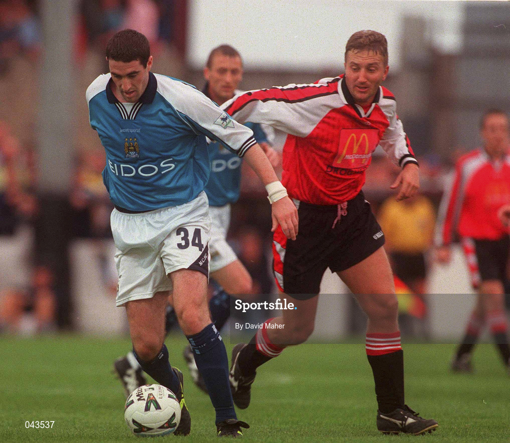24 July 2000; Mark Kennedy of Manchester City in action against Michael McCann of Drogheda United during the Pre-Season Friendly match between Drogheda United and Manchester City at United Park in Drogheda, Louth. Photo by David Maher/Sportsfile