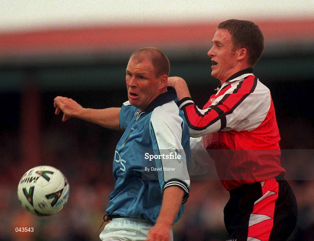 24 July 2000; Robert Taylor of Manchester City in action against Damien Maher of Drogheda United during the Pre-Season Friendly match between Drogheda United and Manchester City at United Park in Drogheda, Louth. Photo by David Maher/Sportsfile