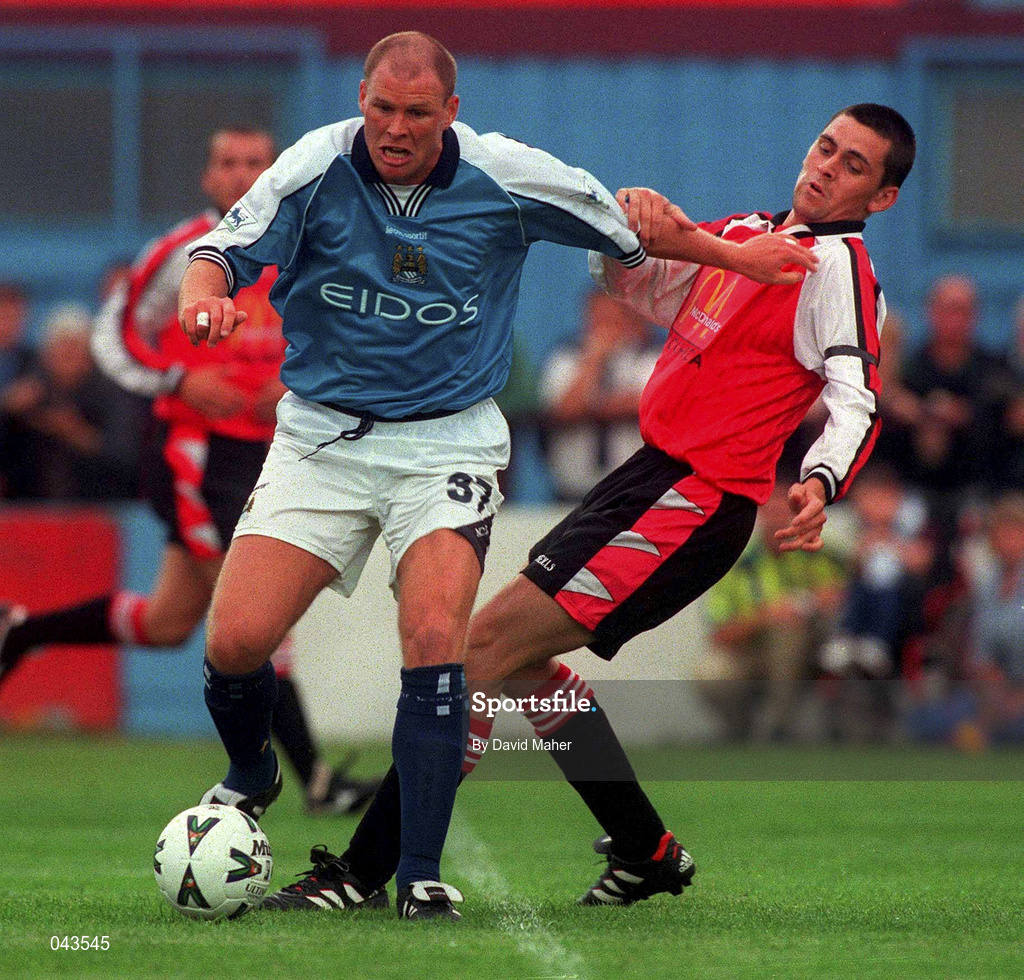 24 July 2000; Robert Taylor of Manchester City in action against Darren O'Keeffe of Drogheda United during the Pre-Season Friendly match between Drogheda United and Manchester City at United Park in Drogheda, Louth. Photo by David Maher/Sportsfile