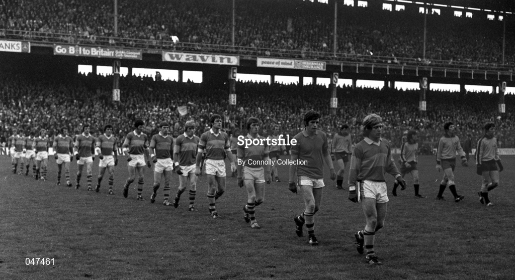 28 September 1975; The Kerry and Dublin teams parade round Croke Park prior to the All-Ireland Football Final between Kerry and Dublin. Photo by Connolly Collection/Sportsfile