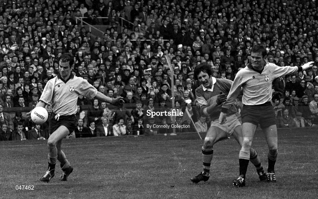 28 September 1975; Dublin's Tony Hanahoe, left, in action during the All-Ireland Football Final between Kerry and Dublin Photo by Connolly Collection/Sportsfile