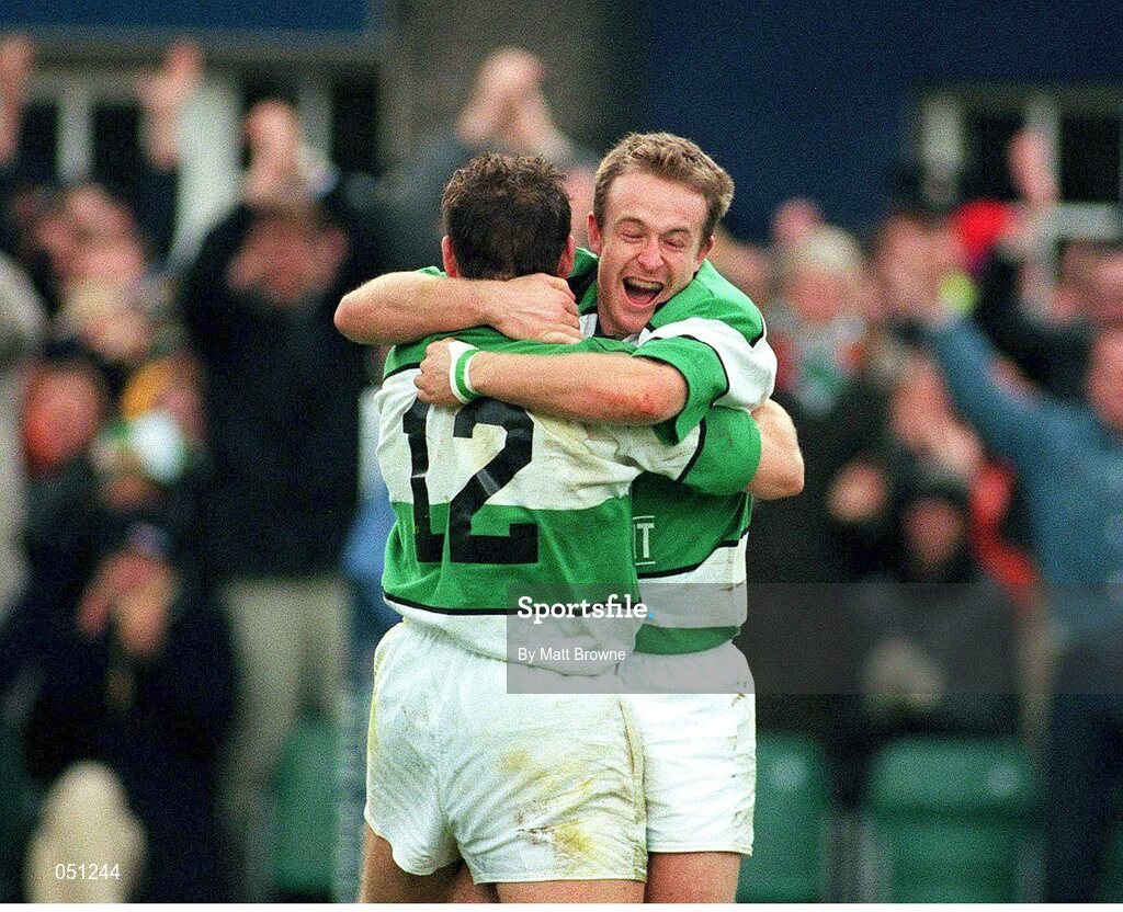 19 November 2000; Ireland's Denis Hickie celebrates with team-mate Rob Henderson, 12, after scoring a try. International friendly, Ireland v South Africa, Lansdowne Road, Dublin. Picture credit: Matt Browne / SPORTSFILE