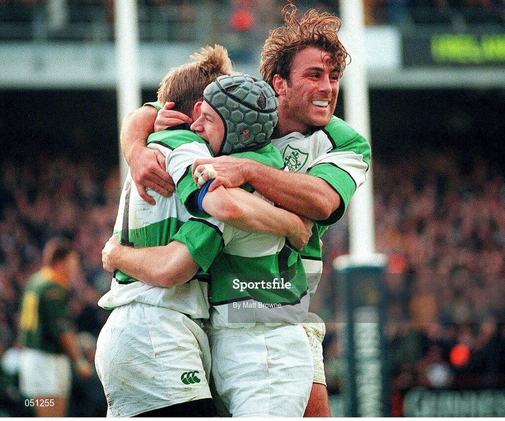 19 November 2000; Ireland's Tyrone Howe, left, celebrates scoring a try with team-mates David Humphries, centre, and Kieron Dawson. International friendly, Ireland v South Africa, Lansdowne Road, Dublin. Picture credit: Matt Browne / SPORTSFILE