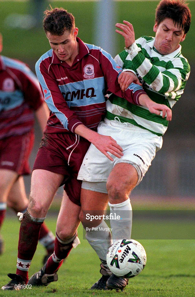 10 December 2000; Scott Morgan of Galway United is tackled by Pascal Vaudequin of Shamrock Rovers during the Eircom League Premier Division match between Shamrock Rovers and Galway United at Morton Stadium, Santry in Dublin. Photo by Pat Murphy/Sportsfile