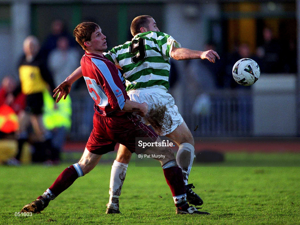 10 December 2000; Billy Cleary of Galway in action against Tony Grant of Shamrock Rovers during the Eircom League Premier Division match between Shamrock Rovers and Galway United at Morton Stadium, Santry in Dublin. Photo by Pat Murphy/Sportsfile