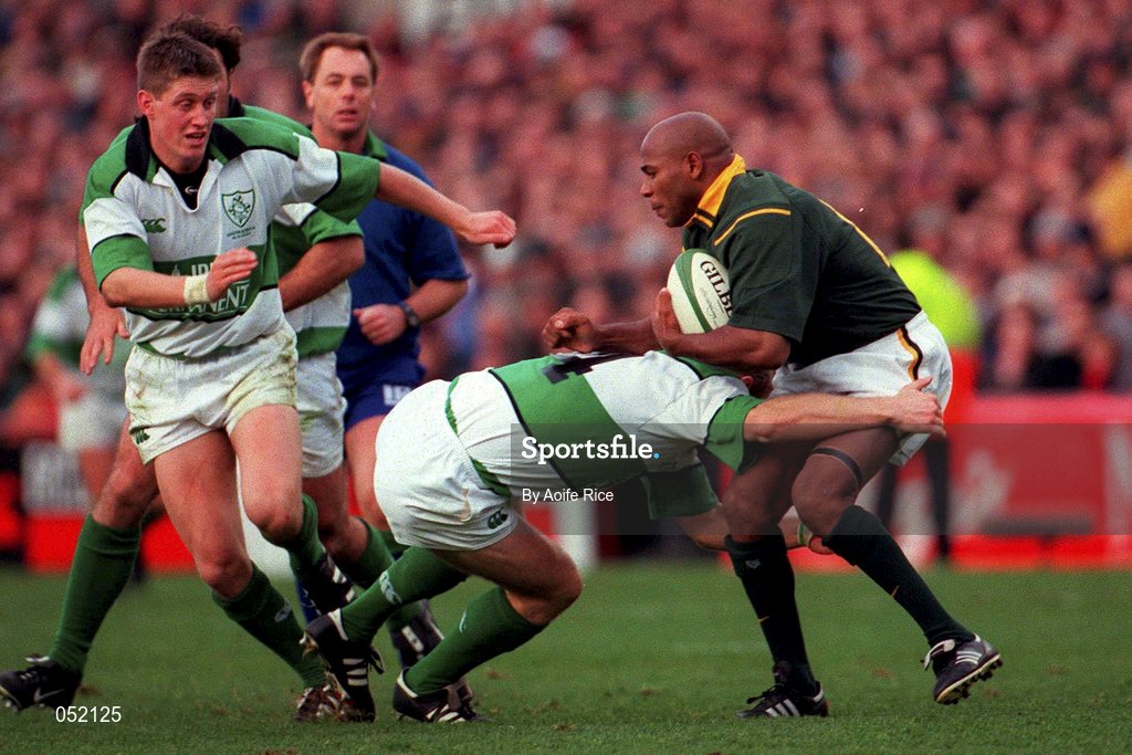 19 November 2000; Chester Williams of South Africa is tackled by Denis Hickie of Ireland during the International Rugby Friendly match between Ireland and South Africa at Lansdowne Road in Dublin. Photo by Aoife Rice/Sportsfile