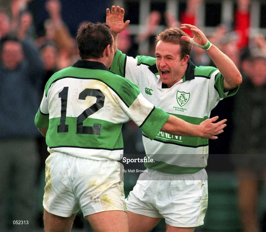 19 November 2000; Denis Hickie of Ireland, right, celebrates after scoring his side's first try with team-mate Rob Henderson during the International Rugby Friendly match between Ireland and South Africa at Lansdowne Road in Dublin. Photo by Matt Browne/Sportsfile