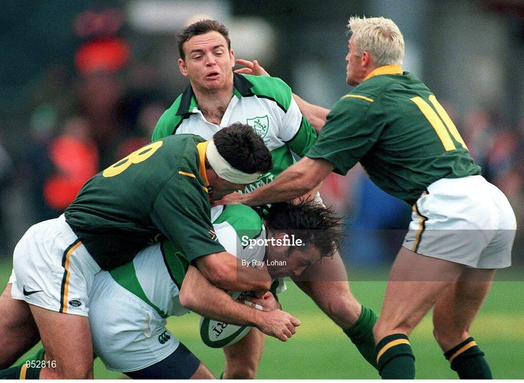 19 November 2000; Ireland's Kieron Dawson, supported by team-mate Rob Henderson, is tackled by Andre Vos, left, and Percy Montgomery, South Africa. International friendly, Ireland v South Africa, Lansdowne Road, Dublin. Picture credit: Ray Lohan / SPORTSFILE