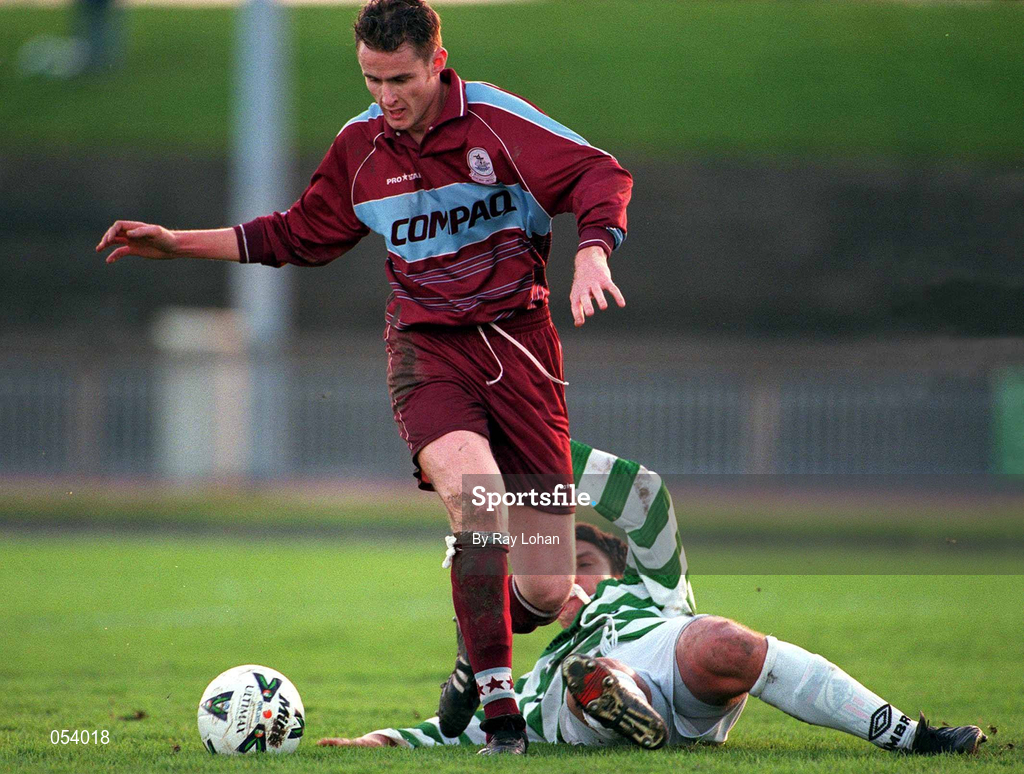 10 December 2000; Scott Morgan of Galway United in action against Pascal Vaudequin of Shamrock Rovers during the Eircom League Premier Division match between Shamrock Rovers and Galway United at Morton Stadium in Santry, Dublin. Photo by Ray Lohan/Sportsfile