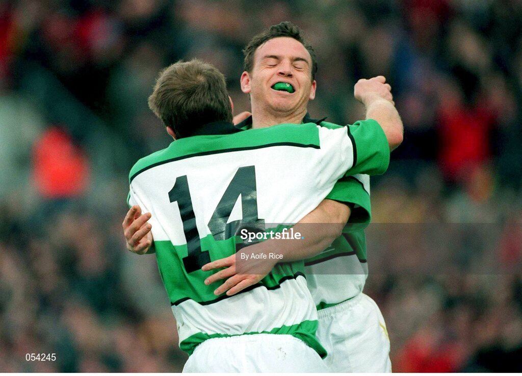 19 November 2000; Denis Hickie, 14, Ireland, celebrates with team-mate Rob Henderson after scoring a try. International friendly, Ireland v South Africa, Lansdowne Road, Dublin. Picture credit: Aoife Rice / SPORTSFILE *** Local Caption *** 19 November 2000; Ireland's Denis Hickie, (14) celebrates after scoring his sides try with team-mate Rob Henderson. International friendly, Ireland v South Africa, Lansdowne Road, Dublin. Picture credit: Aoife Rice / SPORTSFILE