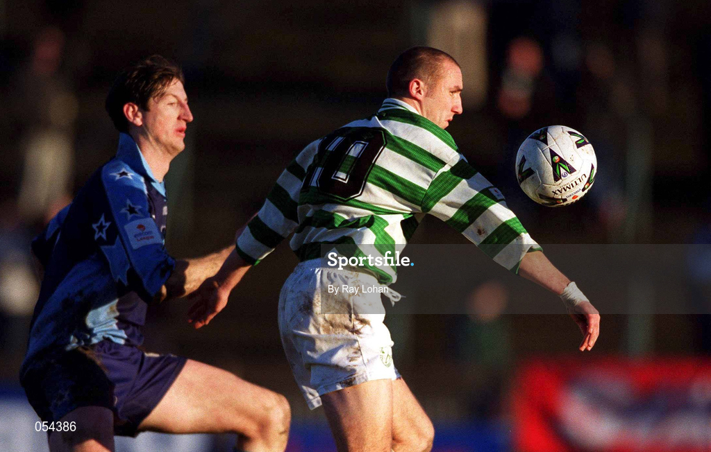 14 January 2001; Tony Grant of Shamrock Rovers in action against Clive Delaney of UCD during the Eircom League Premier Division match between Shamrock Rovers and UCD at Morton Stadium in Santry, Dublin. Photo by Ray Lohan/Sportsfile