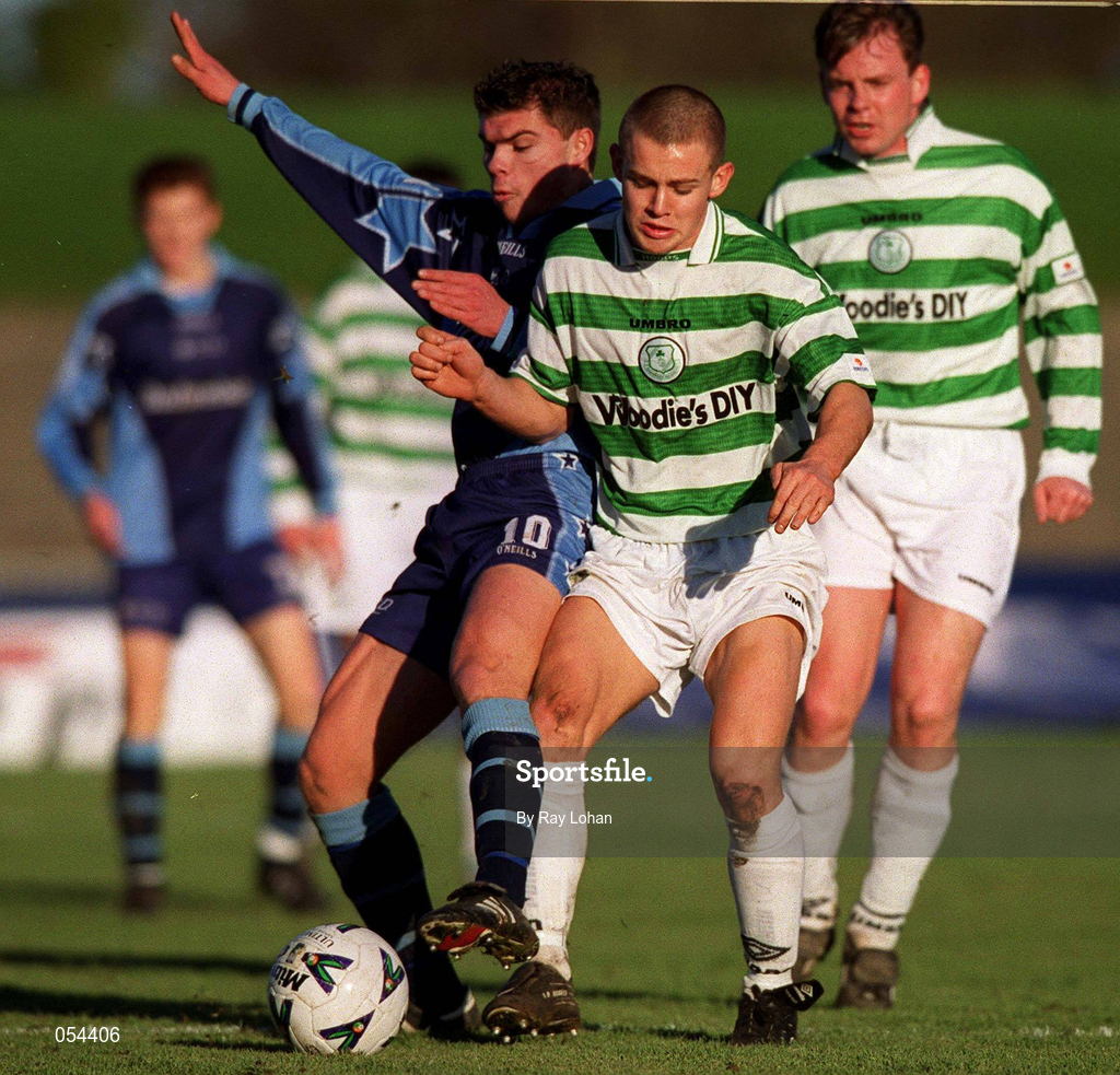 14 January 2001; Kevin Grogan of UCD in action against Shane Robinson of Shamrock Rovers during the Eircom League Premier Division match between Shamrock Rovers and UCD at Morton Stadium in Santry, Dublin. Photo by Ray Lohan/Sportsfile