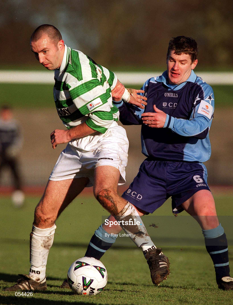 14 January 2001; Tony Grant of Shamrock Rovers in action against Ciaran Kavangh of UCD during the Eircom League Premier Division match between Shamrock Rovers and UCD at Morton Stadium in Santry, Dublin. Photo by Ray Lohan/Sportsfile