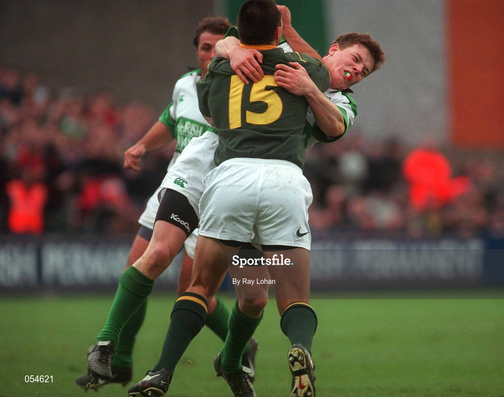 19 November 2000; Thinus Delport of South Africa is tackled by Brian O'Driscoll of Ireland during the International Rugby Friendly match between Ireland and South Africa at Lansdowne Road in Dublin. Photo by Ray Lohan/Sportsfile