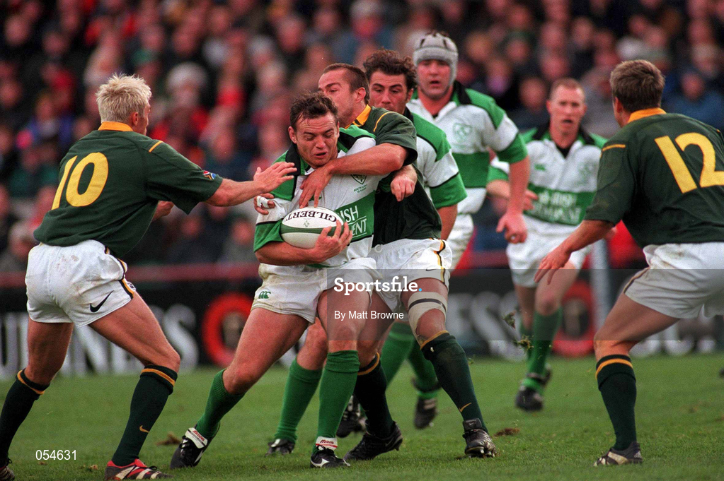 19 November 2000; Rob Henderson of Ireland is tackled by Corne Krige and and Percy Montgomery of South Africa during the International Rugby Friendly match between Ireland and South Africa at Lansdowne Road in Dublin. Photo by Matt Browne/Sportsfile