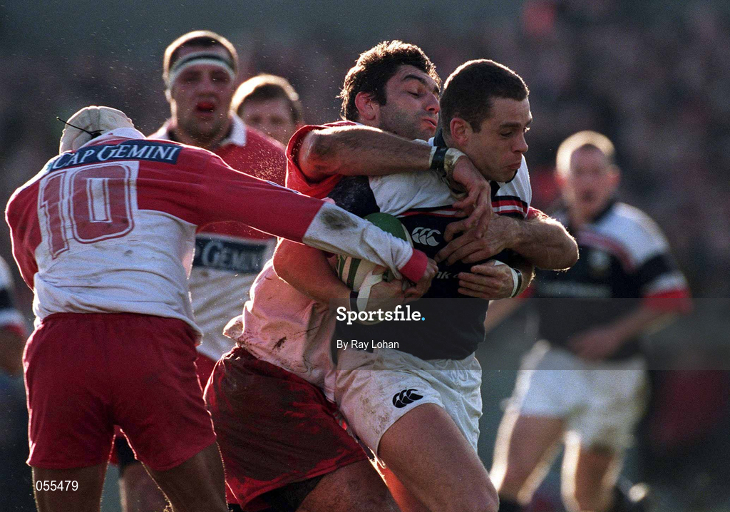 28 January 2001; Dominic Crotty of Munster in action against Franco Botica, 10, and Jean Phillippe Versailles of Biarritz during the Heineken Cup Quarter-Final match between Munster and Biarritz at Thomond Park in Limerick. Photo by Ray Lohan/Sportsfile